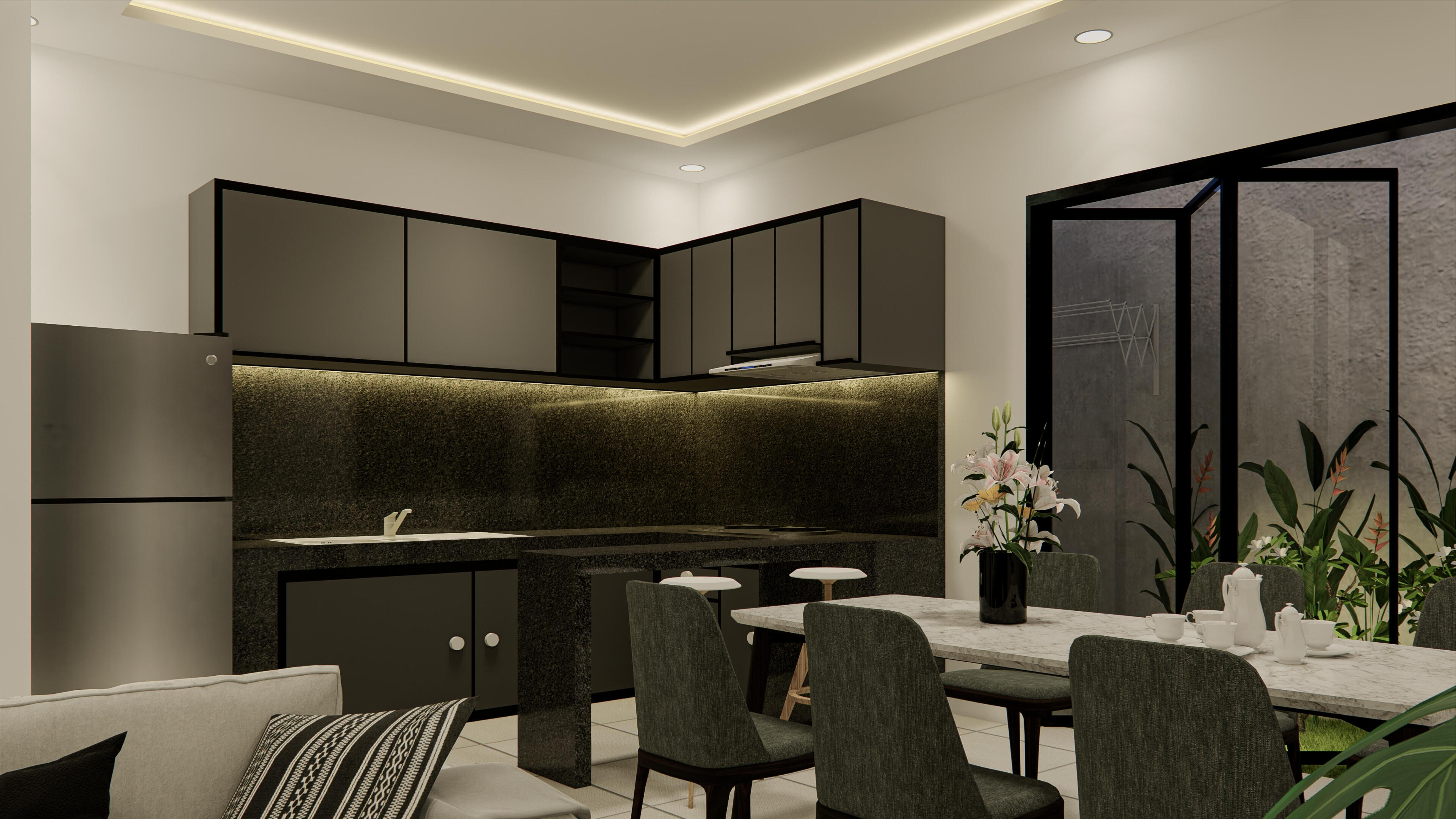 Dapur dan dining area yang lega, terang, dan hidup. Bukan ruang sempit yang tergesa, melainkan ruang hangat tempat cerita keluarga dimulai. Langsung terhubung dengan taman belakang pribadi, tempat cahaya pagi masuk pelan, dan udara segar mengalir tanpa diminta.